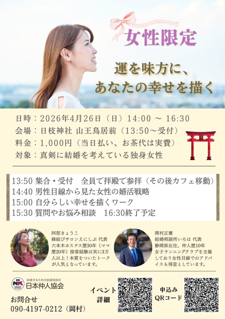 ただのセミナーではありません。神社の清らかな空気の中で心を整え、プロの視点から「選ばれる理由」を学び、自分らしい幸せの形を描く。そんな、心から納得できる婚活への第一歩を一緒に踏み出しませんか?